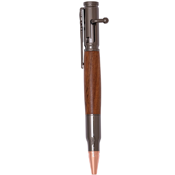 - Стилна метална химикалка съчетаваща дърво с лъскави металик и медни акценти