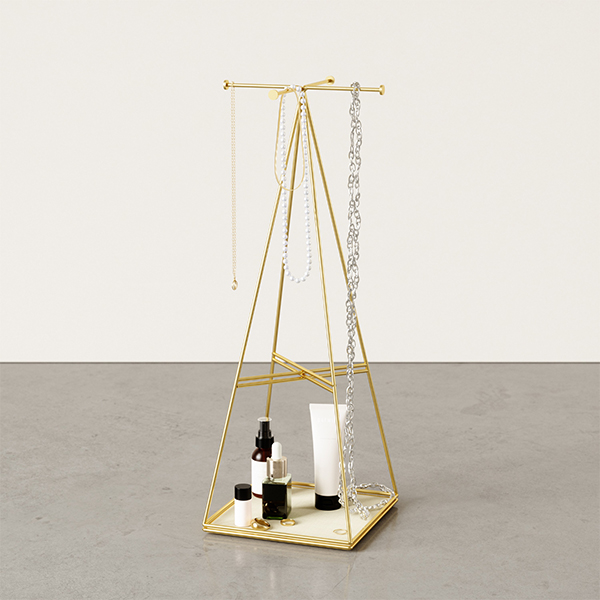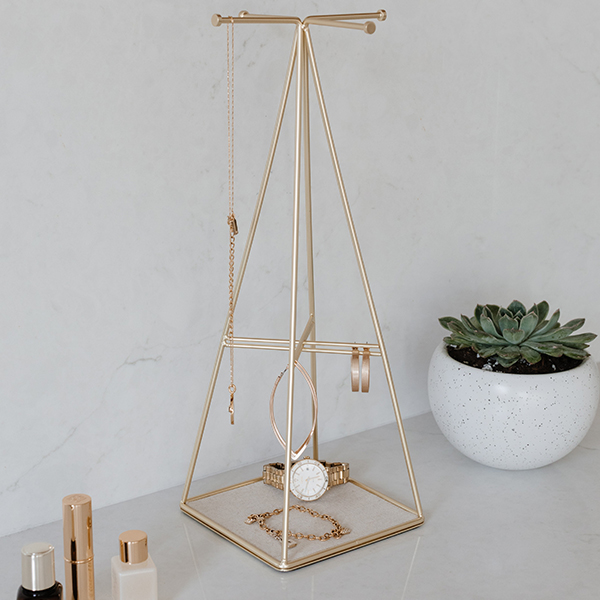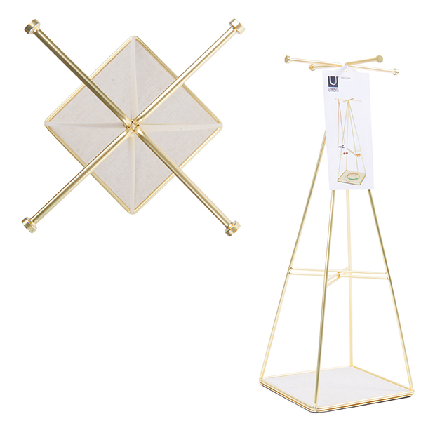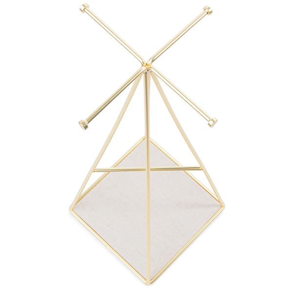 Проектирана по модел на едноименните фоторамки PRISMA, тази поставка за бижута е стилен и красив начин да съхранявате любимите си бижута. Поставката за бижута PRISMA e с матово месингово покритие и е проектирана в пирамидална форма и със четири спици на върха, предназначени за окачване на бижута или аксесоари. Основата на стойката е като табла и е облицована с ленена материя. Тя е перфектното място за съхранение на по-малки предмети като обеци и пръстени. Ленената материя е нежна и предпазва бижутата от надраскване.
