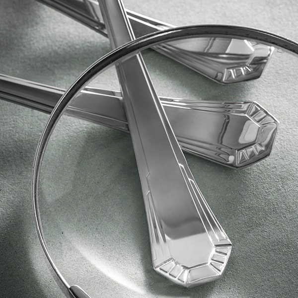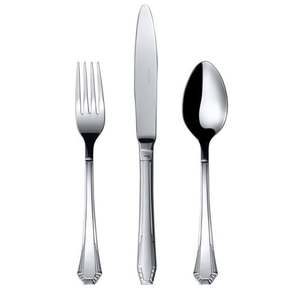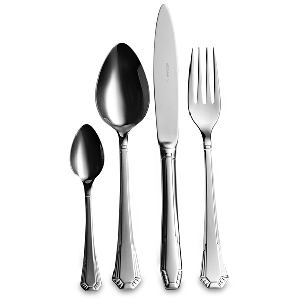 Дизайнът на този модел е силно повлиян от фасадата на една от най-емблематичните португалски сгради - Cine Teatro Éden, разположена в Лисабон. Острите и праволинейни контури, както и декоративните детайли в геометрична форма върху, носят на вашата маса финес и стил. Всички прибори от марката Herdmar са произведени от висококачествена неръждаема стомана, съгласно най-съвременните изисквания за производство на прибори и под строг контрол на качеството. При правилна употреба и грижлива поддръжка, Вашите прибори Herdmar ще останат блестящи, полирани и в добро състояние за дълго време. Указания за почистване и съхранение: Ръчно почистване: След употреба, измийте приборите, колкото е възможно по-скоро, за да избегнете продължителен контакт с остатъците от храна. Използвайте гореща вода, неутрален и мек почистващ препарат и гладка гъба. След измиване, подсушете незабавно с мека кърпа. Почистване в съдомиялна машина: Използвайте само висококачествени препарати. Измийте приборите, колкото е възможно по-скоро след тяхната употреба, като не зареждате прекалено много кошницата за прибори в съдомиялната машина. Поставяйте ножовете винаги с остриетата нагоре и отделно от другите прибори. Лъжиците и вилиците трябва да се поставят в кошницата с дръжките надолу. Никога не слагайте в кошницата прибори от неръждаема стомана, заедно с други метали, позлатени или посребрени прибори за хранене. Препоръчително е - след измиване - веднага да извадите ножовете от съдомиялната машина и да ги подсушите със суха и мека кърпа. Не съхранявайте приборите за хранене на влажни места, където върху приборите могат да се образуват петна. Неправилното почистване също може да доведе до поява на петна по приборите. Петната могат да бъдат почистени от приборите, като ги потопите в разтвор от топла вода и лимонена киселина за 15 минути (1 супена лъжица лимонена киселина на 1 литър вода.)