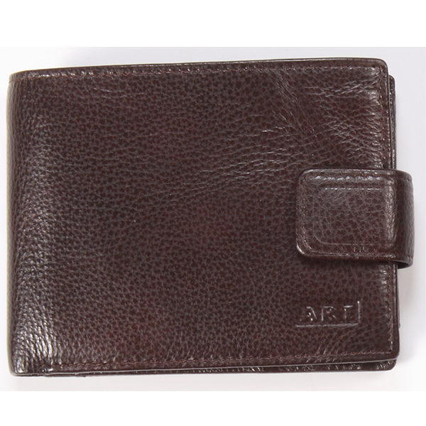 Стилен мъжки портфейл, естествена кожа; с две разделения за банкноти, плюс цип; вътрешен монетник; с няколко отделения за лични документи и карти със закопчаване тик-так