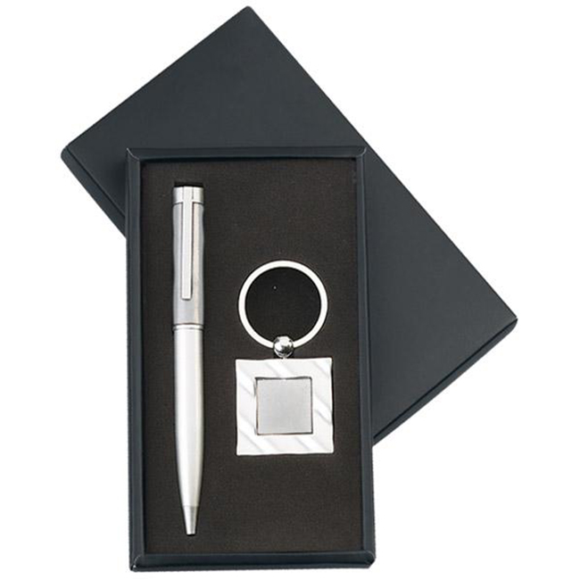 • Комплект химикалка и ключодържател в кутия. Материал пишещи средства: метал.