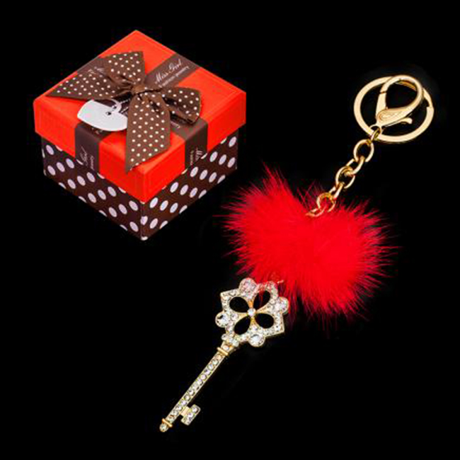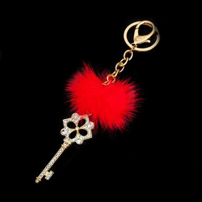 - Ключодържателят е нежна комбинация на златно ключе с червено пухче и сияещи кристали.
