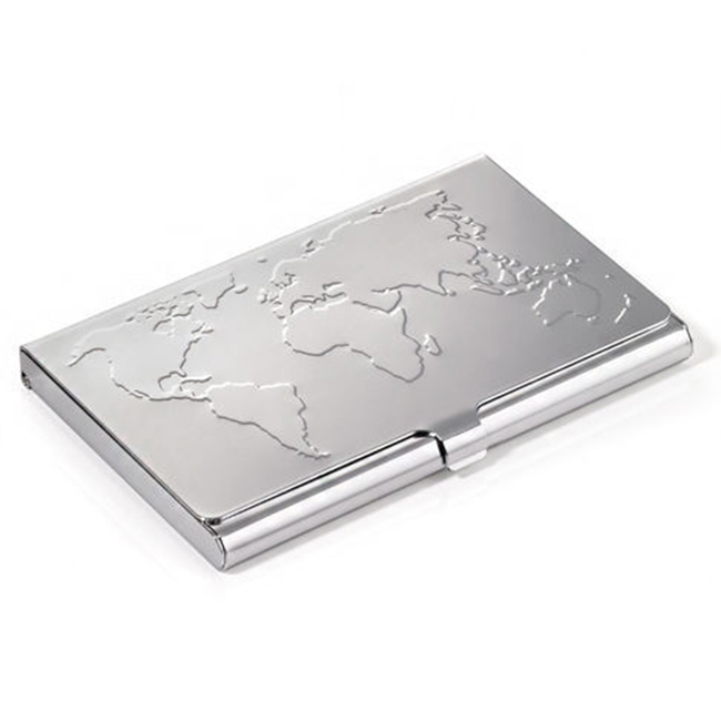 • Визитник TROIKA с лъскава хромирана повърхност с релефна карта на света за 17 визитни картички