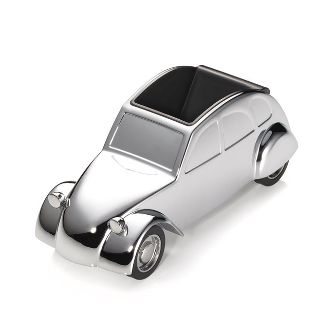 - Класическа кола 2CV, тежест за притискане на хартия и моливник, с магнит за кламери, вкл. 5 кламера, с пружинен механизъм за движение (дръпни назад - пусни), лъскав хром