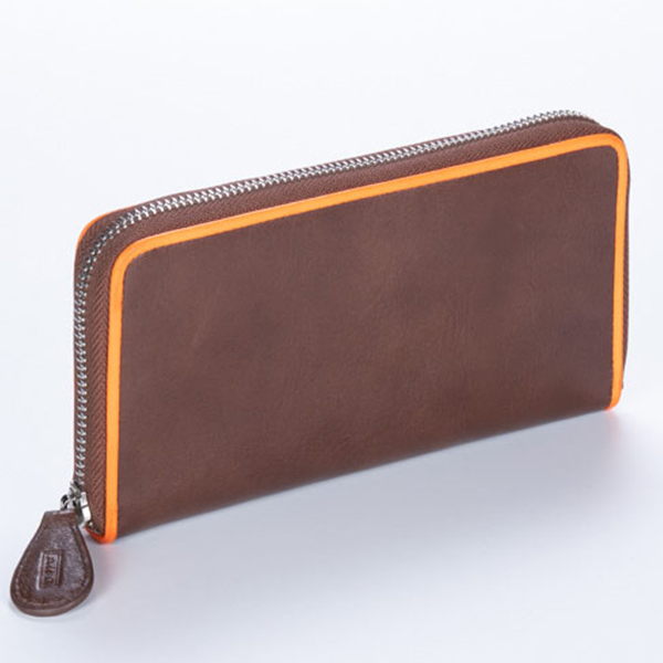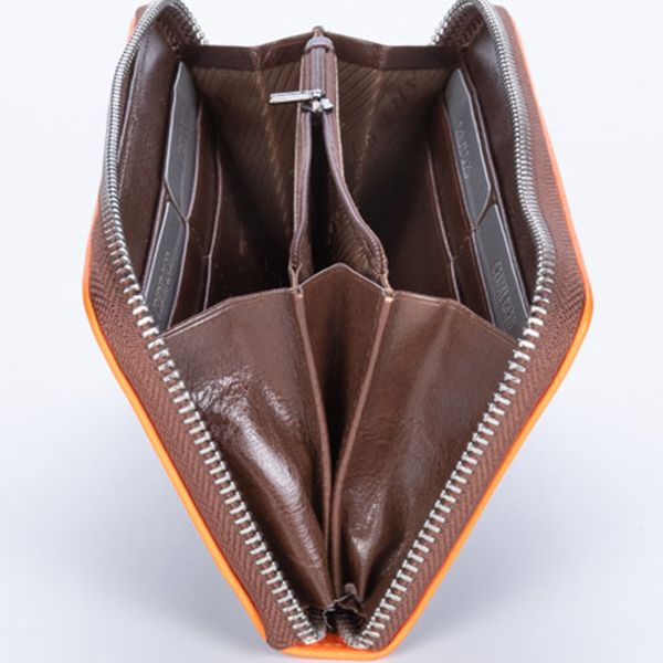 Дамски портфейл с оранжев кант и с външен цип по дължина.