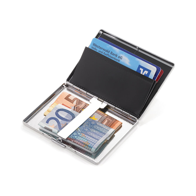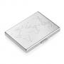 - Визитник / Калъф TROIKA с лъскава хромирана повърхност и дизайнерски стикер с релефна карта на света, черно PVC отделение за 6 кредитни карти, метален клипс за банкноти