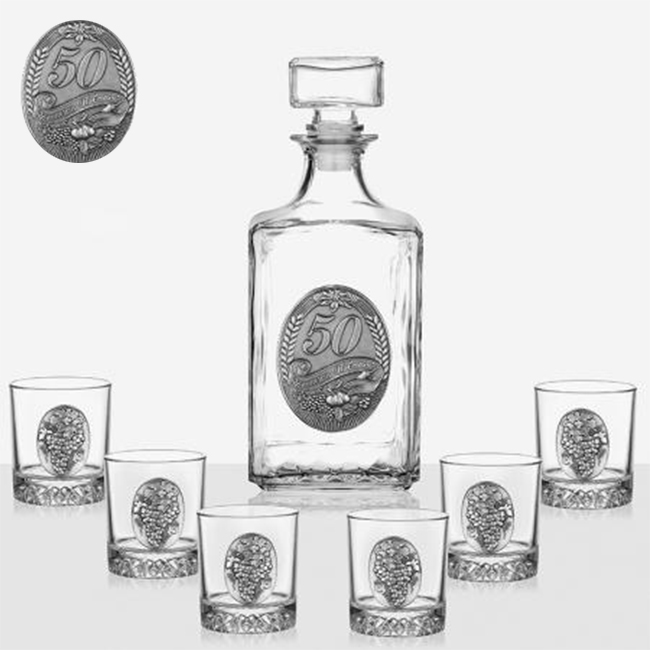 Сет за алкохол от стъкло, издържан в класически стил, състоящ се от 6 бр. чаши и четвъртита бутилка с масивна стъклена запушалка. Този строг дизайн завършва визията си с изящно инкрустиран метален грозд с листа от калай и сребро и юбилейна гравюра 50, което го превръща в луксозно празнично предложение, обогатяващ етикета на сервиране на качествени напитки.