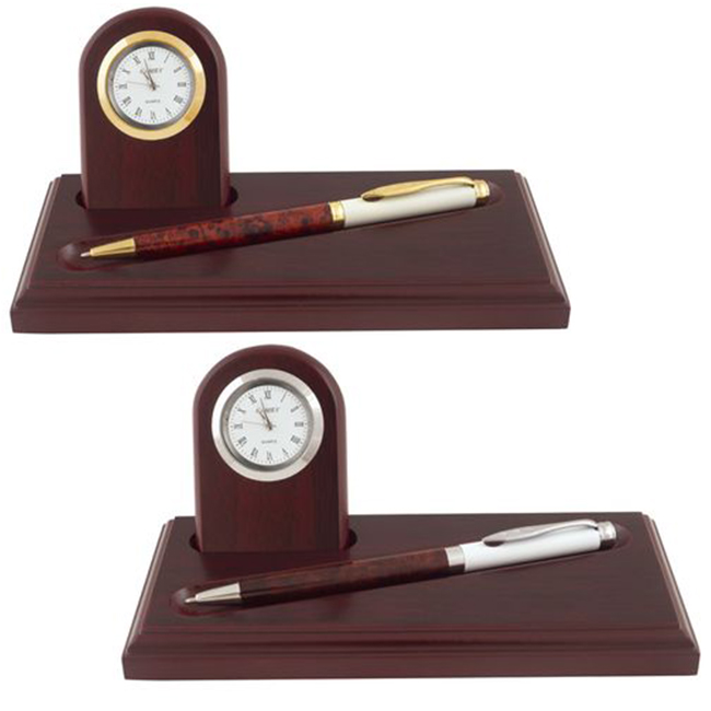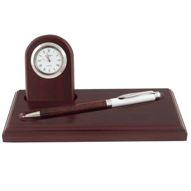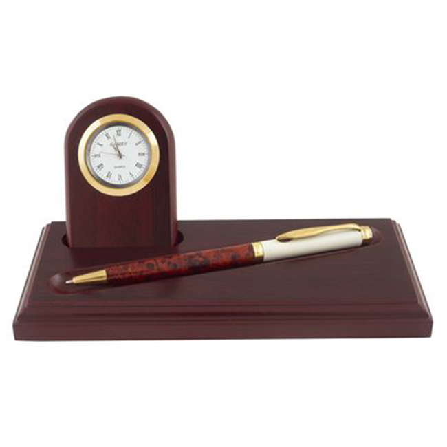 - Дървена поставка за бюро с часовник и метална химикалка.