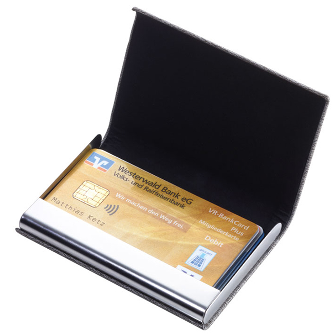 - Калъф за кредитни карти с каишка за изваждане на картите.
