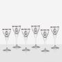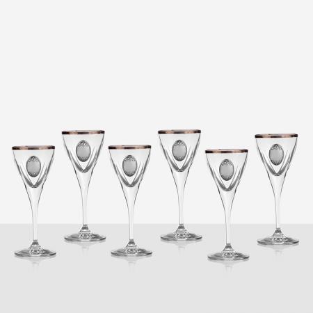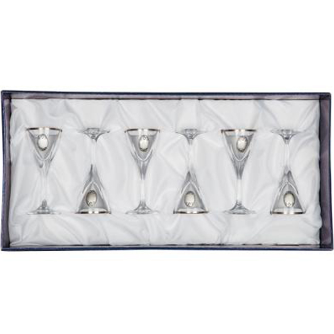 - Стилен комплект от 6 чаши за ракия на столче с изчистена посребрена плочка, произведени от италианската фирма RCR Crystal.