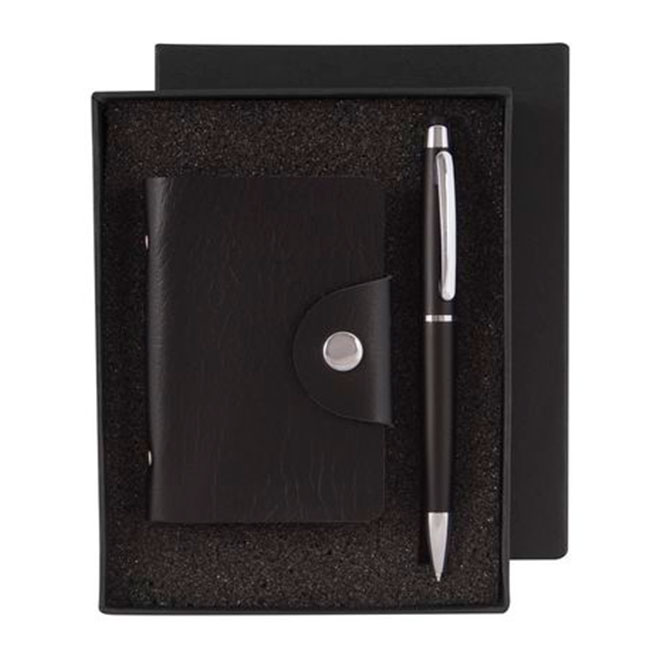 - Комплект с кожен калъф за документи и метална химикалка с накрайник за тъч скрийн.