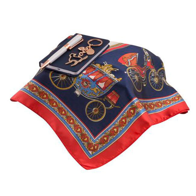 • Включва бележник, ключодържател, голям шал и златна химикалка в черна картонена кутия.