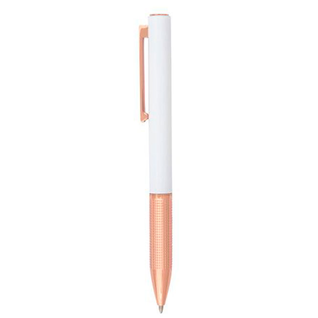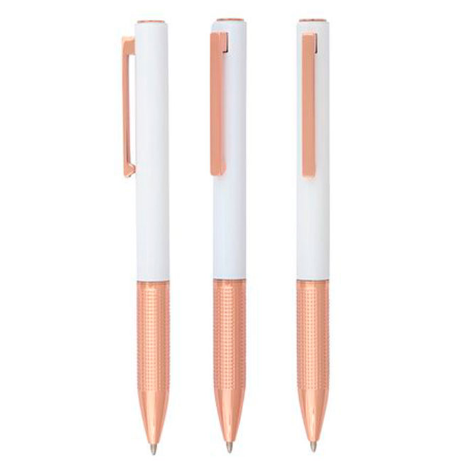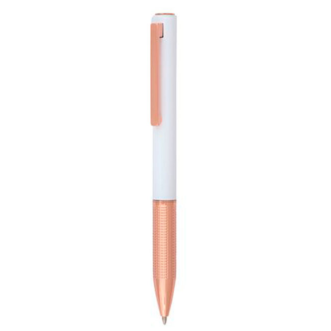 • В бял перлен цвят с медни елементи.