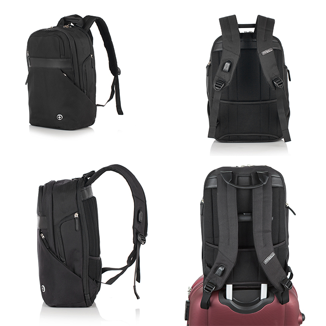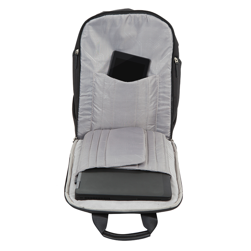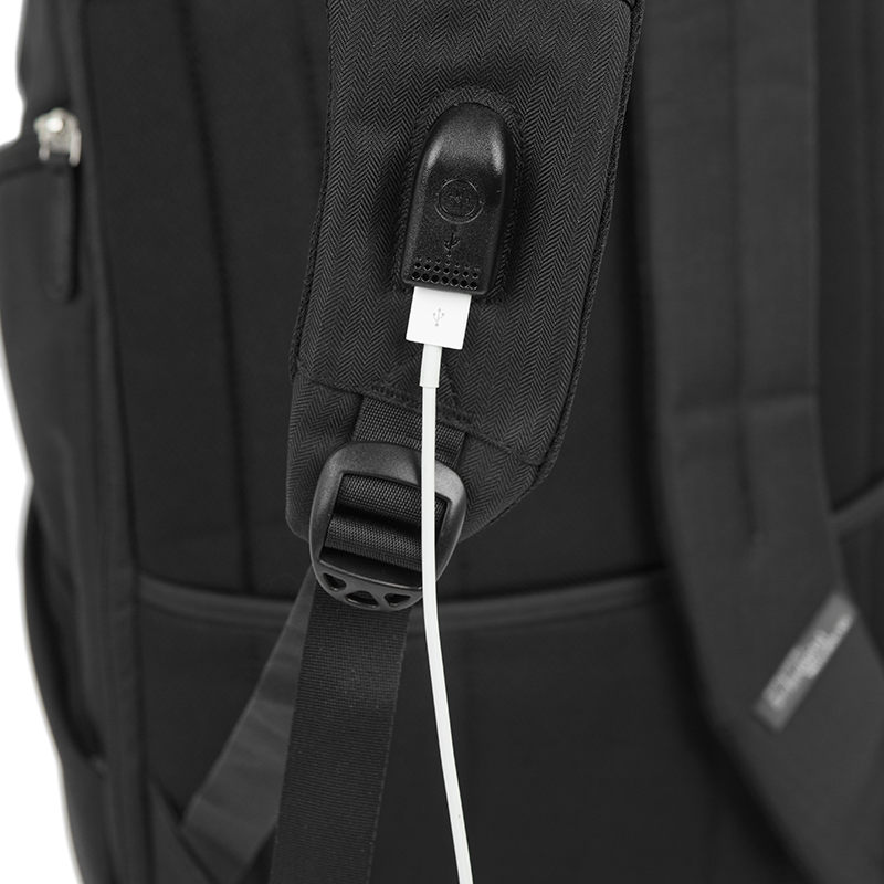 Удобства на раницата: Наличие на USB port; RFID защита за безконтактни карти; Основно отделение за лични вещи; Отделение за документи с ластик; Отделение за портфейл/портмоне; Защитено отделение за лаптоп 14 инча; Защитено отделение за таблет; Защитено отделение за мобилен телефон. Външен джоб с цип; Джоб за очила; Два външни джоба с цип. Джоб за бутилка/чадър; Вътрешен джоб с цип и мрежа; Джоб за кабел; Къса дръжка; Ергономични регулиращи презрамки с USB port; Анатомичен гръб; Водонепропусклив материал.