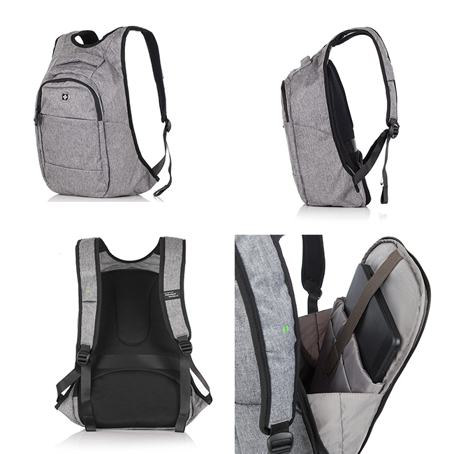 Удобства на раницата: Наличие на USB port; RFID защита за безконтактни карти; Основно отделение за лични вещи; Отделение за портфейл/портмоне; Защитено отделение за лаптоп 14 инча, таблет и мобилен телефон; Вътрешно отделение за батерия Power Bank; Външен джоб с цип; Джоб за бутилка/чадър; Джоб за поставяне върху дръжката на куфар; Джоб за кабел; Ципове с лого Swiss Digital; Къса дръжка; Ергономични регулиращи презрамки с USB port; Анатомичен гръб; Водонепропусклив материал.