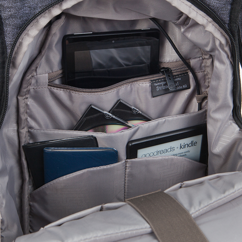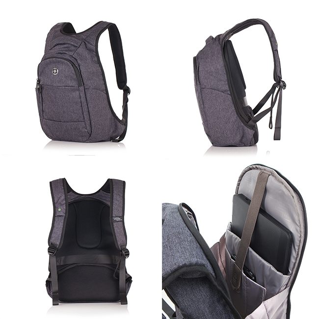 Удобства на раницата: Наличие на USB port; RFID защита за безконтактни карти; Основно отделение за лични вещи; Отделение за портфейл/портмоне; Защитено отделение за лаптоп 14 инча, таблет и мобилен телефон; Вътрешно отделение за батерия Power Bank; Външен джоб с цип; Джоб за бутилка/чадър; Джоб за поставяне върху дръжката на куфар; Джоб за кабел; Ципове с лого Swiss Digital; Къса дръжка; Ергономични регулиращи презрамки с USB port; Анатомичен гръб; Водонепропусклив материал.