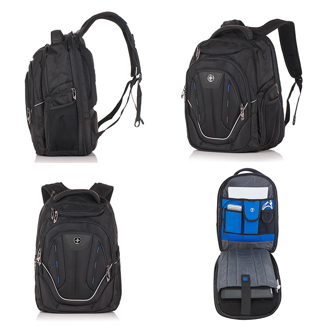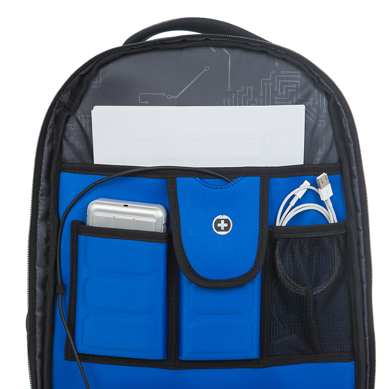 Удобства на раницата: Наличие на USB port; RFID защита за безконтактни карти; Водонепропусклив материал; Основно отделение за лични вещи; Външно отделение органайзер с цип; Отделение за документи с ластик; Отделение за портфейл/портмоне; Защитено отделение за лаптоп 14 инча; Защитено отделение за таблет; Защитено отделение за мобилен телефон. Вътрешно отделение за батерия Power Bank; Джоб органайзер за химикалки; Външен джоб с цип; Джоб за очила; Два външни джоба с цип; Джоб за бутилка/чадър; Вътрешен джоб с цип и мрежа; Джоб за поставяне върху дръжката на куфар; Джоб за кабел; Ципове с лого Swiss Digital; Ключодържател; Ергономични дръжки; Къса дръжка; Ергономични регулируеми презрамки с USB port; Анатомичен гръб.
