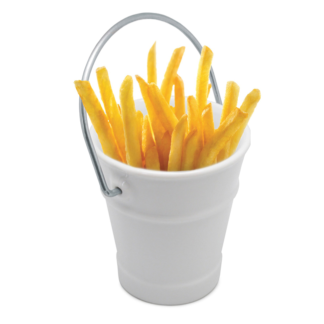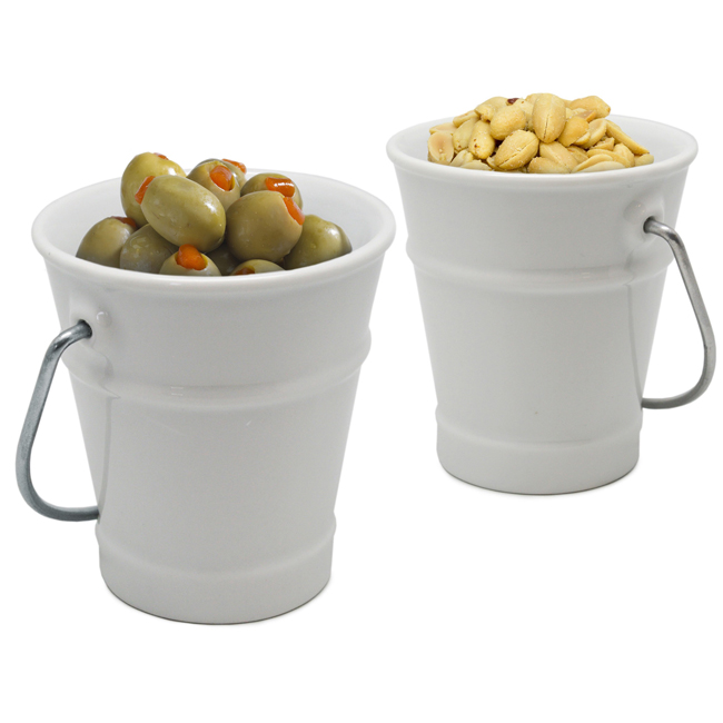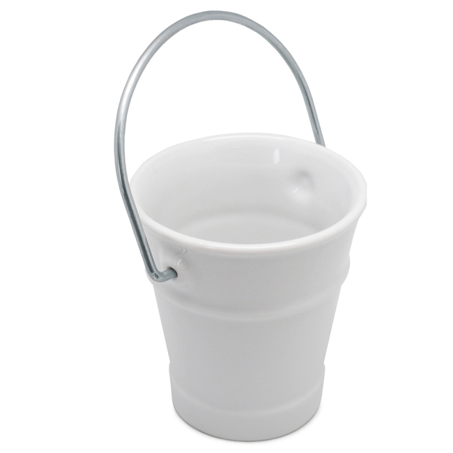 Забавна и оригинална мини кофичка за сервиране на ядки, хапки, конфитюр, сосове или ордьоври. Изработена от качествен порцелан, с метална дръжка.