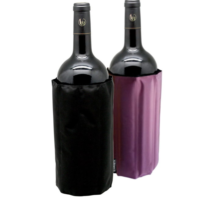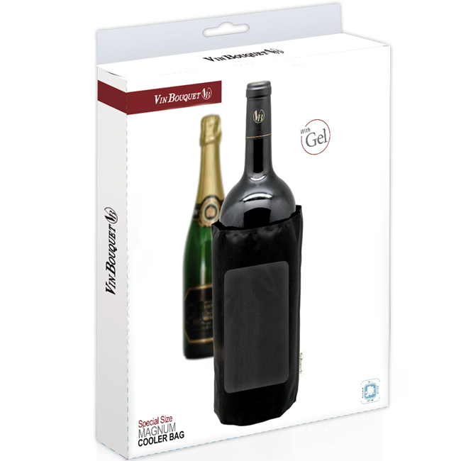 Охладителят с гел на испанската компания Vin Bouquet е модерен продукт със стилен дизайн. Двулицев – в черно и бордо, за да можете да го съчетавате с украсата за всякакъв повод. С гел, за да може да поддържа по-дълго най-добрата температура за консумация. С велкро лепенка, за да се поставя лесно и удобно. Голям, за да събира в себе си бутилка с големина 1,5 л.