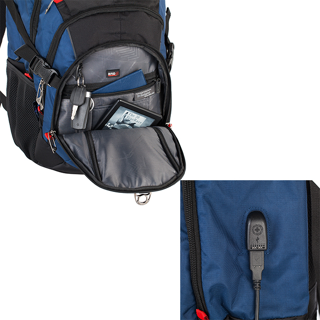 Удобства на раницата: Наличие на USB port; RFID защита за безконтактни карти. Водонепропусклив материал; Външно отделение органайзер с цип; Основно отделение за лични вещи; Външно отделение органайзер с цип; Отделение за портфейл/портмоне; Защитено отделение за лаптоп 14 инча; Защитено отделение за мобилен телефон; Вътрешно отделение за батерия Външен джоб с цип; Джоб за очила; Два външни джоба с цип; Джоб за бутилка/чадър; Джоб за поставяне върху дръжката на куфар; Ципове с лого Swiss Digital; Ключодържател; Ергономични дръжки; Къса дръжка; Регулируеми комфортни презрамки; Анатомичен гръб; Уплътнен гръб