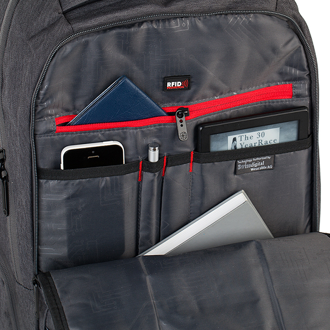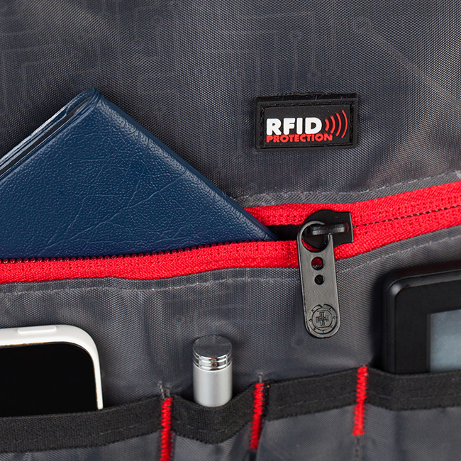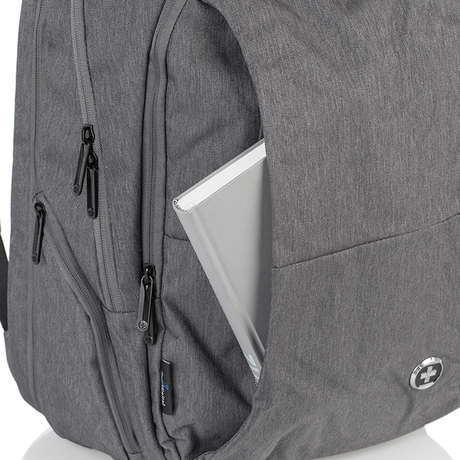 Удобства на раницата: RFID защита за безконтактни карти; Водонепропусклив материал, Основно отделение за лични вещи; Външно отделение органайзер с цип; Отделение за портфейл/портмоне; Защитено отделение за лаптоп 14 инча; Защитено отделение за таблет; Защитено отделение за мобилен телефон; Джоб органайзер за химикалки; Външен джоб с цип; Два външни джоба с цип. Джоб за бутилка/чадър; Джоб за кабел; Ергономични дръжки; Регулируеми комфортни презрамки; Анатомичен гръб; Уплътнен гръб