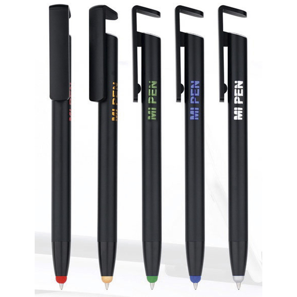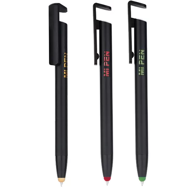 Рекламна химикалка с метално тяло и пластмасови елементи. Химикалката разполага с накрайник за тъчскрийн дисплеи и стойка за мобилен телефон. Благодарение на специално метално покритие, вашето лого, надпис или послание може да блести в цвят след лазерно гравиране на химикалката.