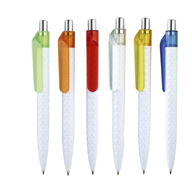 Рекламна химикалка от висококачествена пластмаса с релефно тяло и цветен, плосък клип. Структурата на тялото е с плетена шарка. Подходяща за брандиране върху клипа.