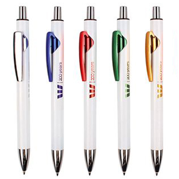 Рекламна химикалка от алуминии с цветен широк клипс и бяло тяло. Благодарение на специално метално покритие, вашето лого, надпис или послание може да блести в цвят след лазерно гравиране на химикалката.