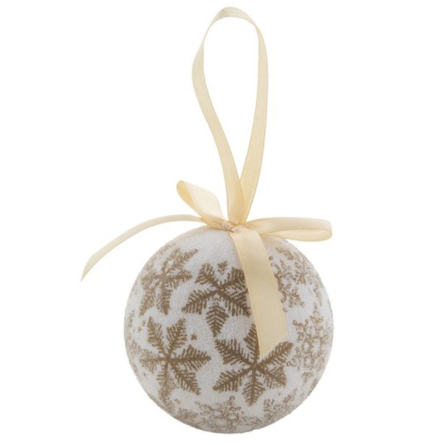• Коледна топка в перлен цвят със златни снежинки.