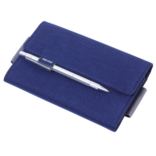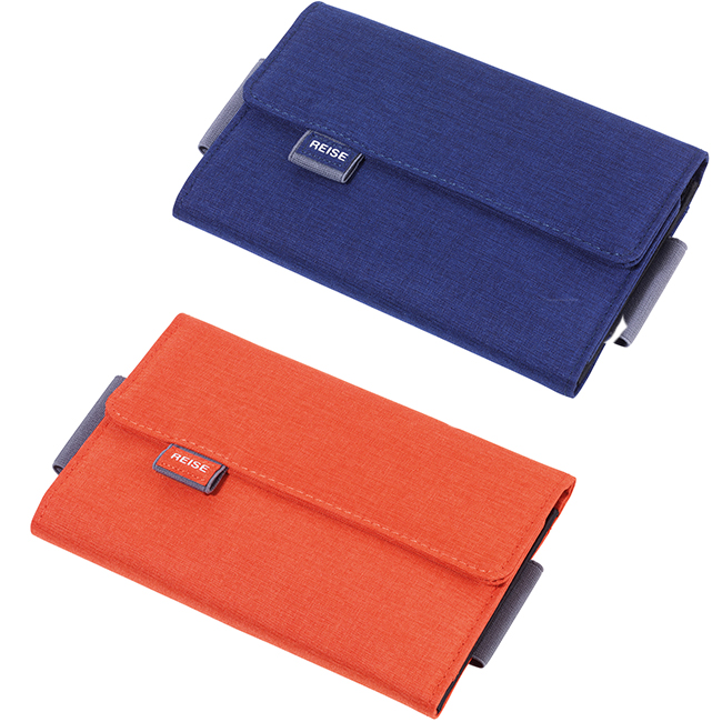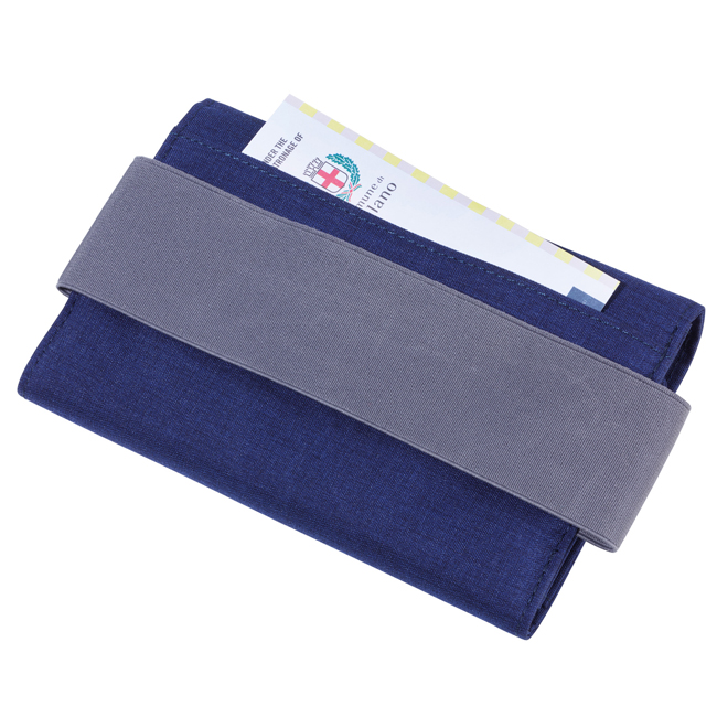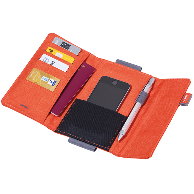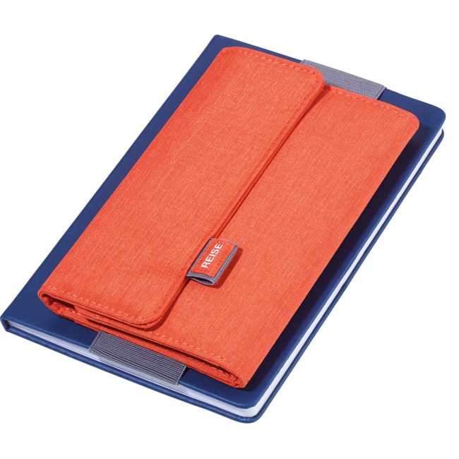 Калъф за пътни документи с магнитно затваряне. 5 вътрешни отделения паспорт, лични и кредитни карти, 1 отделение с ластичен джоб за телефон, 1 външно отделение, 2 ластични халки за химикалки, ластичен колан за прикрепяне на тефтер А5.