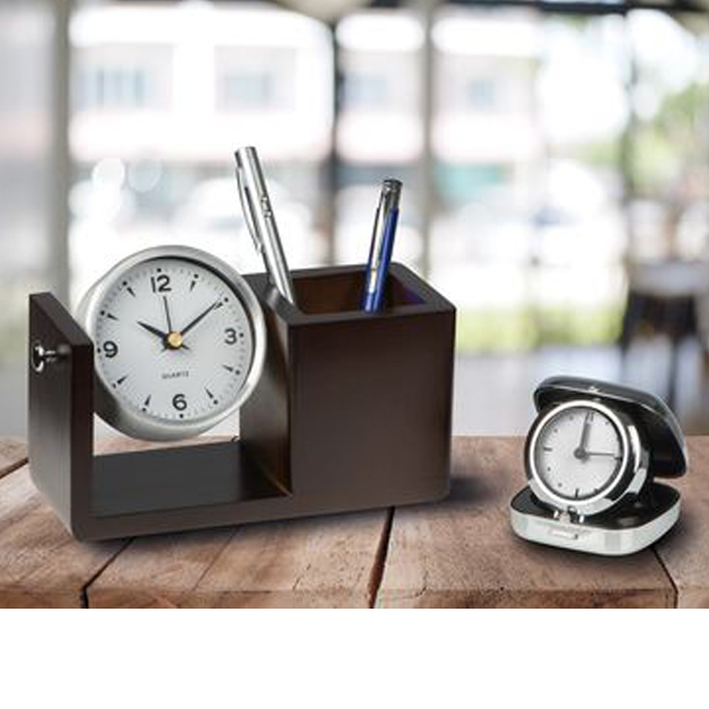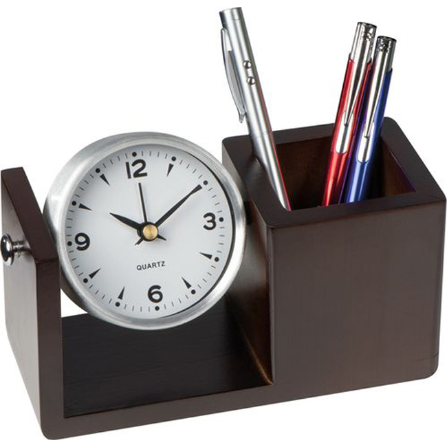 • Комплект за бюро с въртящ се часовник и моливник от лакирано дърво.