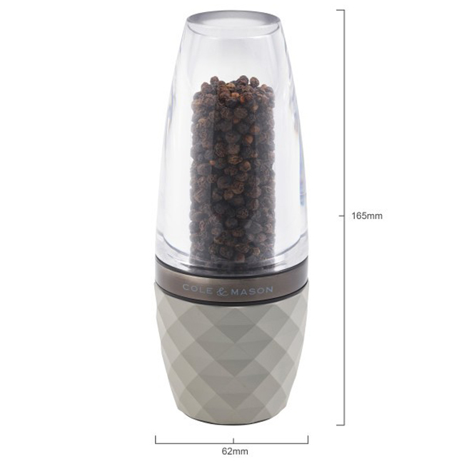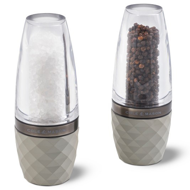 Стилни и съвременни мелници за сол и пипер, вдъхновени от градската британска архитектура. Без усилие съчетават изчистената красота и семплия вид на камъка, като същевременно остават безценен всекидневен кухненски аксесоар. Опростената форма на прозрачния акрилен контейнер е проектирана да контрастира с геометрично оформения каменен фундамент. Структурата и мотива на камъка създават мелница, която Ви насърчава да я вземете и да я използвате при всяка възможност.