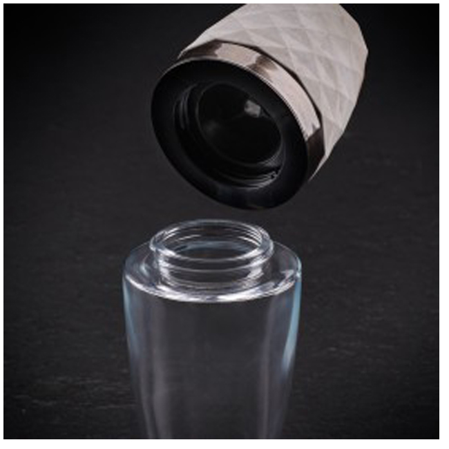 Изработени прозрачен акрил и технически камък, тези мелници са семпли, но заемащи централно място във всеки кът за хранене. Прозрачния контейнер контрастира добре с геометрично оформения тъмносив технически камък, който се акцентира от пръстена от оксидирана стомана в средата. Камъкът е завършен със слой от прозрачен лак, за да се защити неговото покритие и да се предотвратят следите от ежедневна употреба. В основата е поставен пластмасов пръстен, който предпазва работните повърхности от контакти с камъка, за да се избегнат надраскване или повреда.