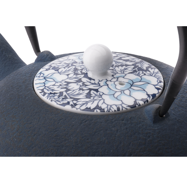 Чайникът Yantai има порцеланов капак с мотив на цветя.