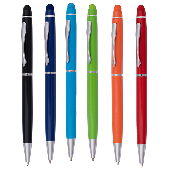 Метална химикалка с цветен корпус, лъскави хромирани елементи и стилус за тъчскрийн на върха, в същия цвят. Този артикул е подходящ за различни методи на брандиране с вашето фирмено лого или послание.
