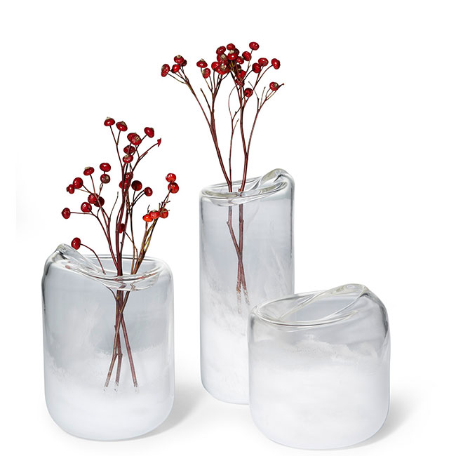 Изработена от ръчно издухано стъкло, цилиндричната ваза SNOW е с декор в бяло в долната част. Това създава впечатлението, че във вазата има сняг.