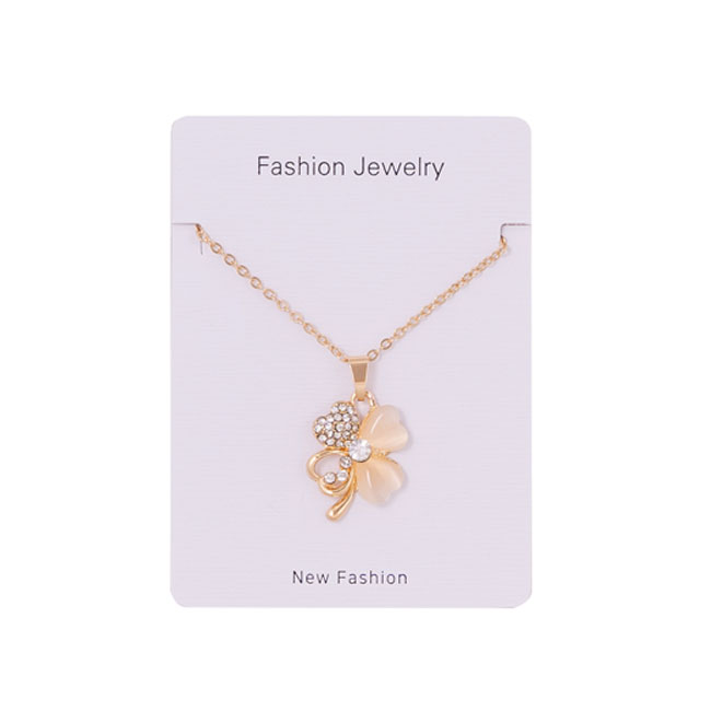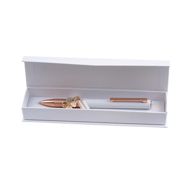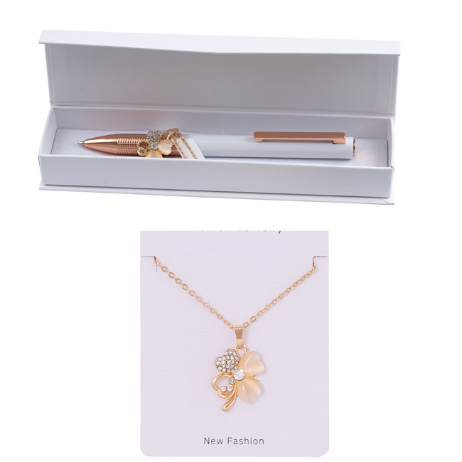 • Луксозен дамски комплект метална химикалка съчетаваща стилен бял лак с елементи в розово злато и колие с детелина.