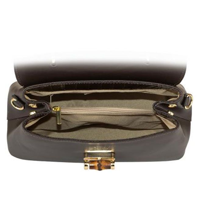 - Чантата се затваря с механизъм, изработен от бамбук и метал. Съдържа 2 джоба с цип и 2 без цип.