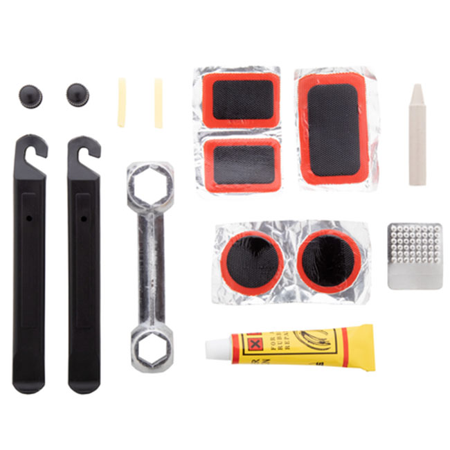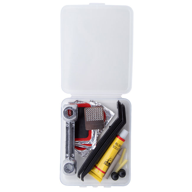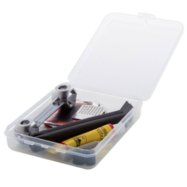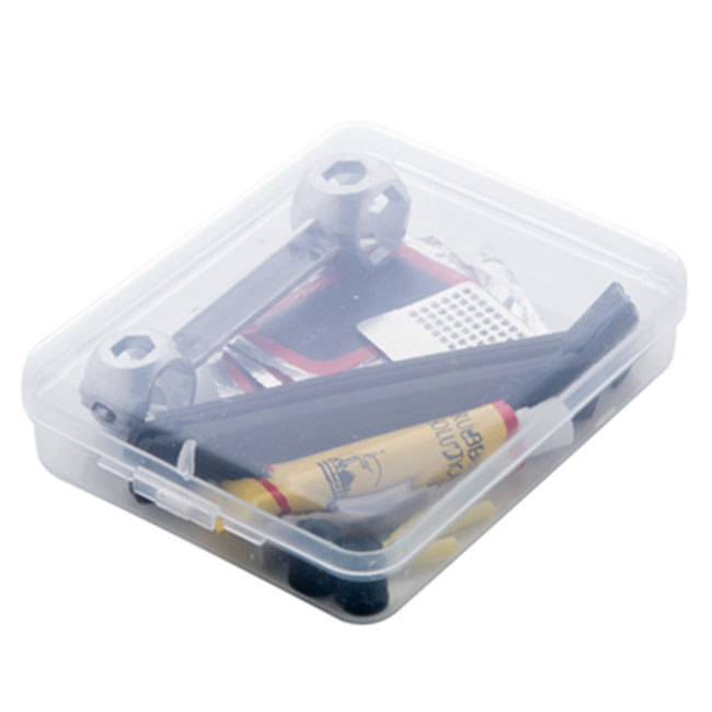 - Ремонтен комплект за велосипеди в прозрачна пластмасова кутия. Включва шестограмен ключ и комплект за ремонт на спукани гуми (2 лоста за гуми, ренде, лепило, 2 капачки за вентили, 2 тръби за вентили и 5 лепенки за гуми).