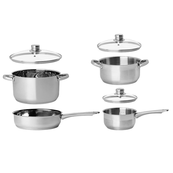 Всички съдове са изработени от издръжлива и лесна за поддържане неръждаема стомана. Тенджерите и съда за сос са със стъклени капаци и измервателна скала от вътрешната страна, което улеснява измерването на точните количества на течностите и наблюдението на приготвянето на храната през стъкления капак. Отворът за пара намалява налягането, така че храната да не изкипи лесно. .