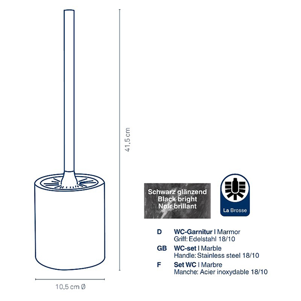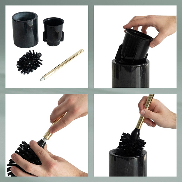 Защо тези аксесоари за баня са черни? Защото за Kela е важно да покрие широка гама от стилове, възможности и дизайни в областта на аксесоарите за баня, така че да има по нещо за всеки вкус. Поставката на четката за тоалетна от серия Liron е изработена от мрамор и има полирана повърхност, така че може да има фини разлики в шарката на различните комплекти. Има практичен вътрешен контейнер, който се почиства лесно.